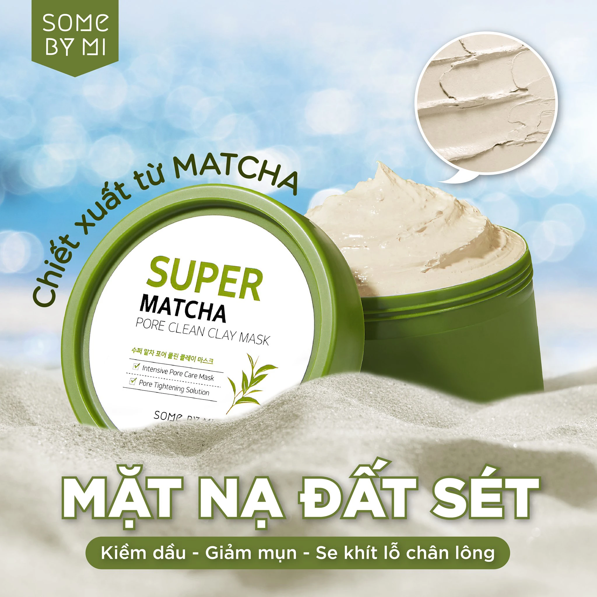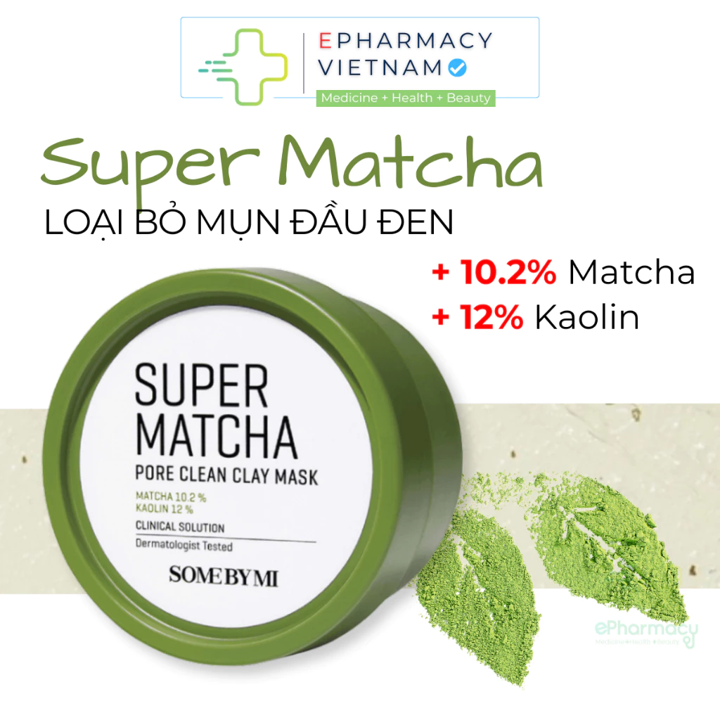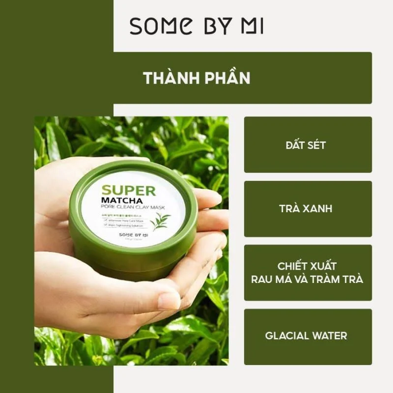 Mặt Nạ Đất Sét Làm Sạch Lỗ Chân Lông Some By Mi Super Matcha Pore Clean Clay Mask có thành phần lành tính chứa Đất Sét Biển giúp giảm dầu thừa, làm sạch sâu lỗ chân lông, cùng chiết xuất Trà Xanh Matcha giúp mang lại làn da tươi sáng, cung cấp độ ẩm, không làm da khô căng sau khi đắp. Với kết cấu đất sét đặc mịn, dễ tán đều trên bề mặt da, mặt nạ đất sét trà xanh Some By Mi giúp làm sạch và chăm sóc da chỉ trong 15 phút, mang mùi hương trà xanh dịu nhẹ giúp quá trình chăm sóc da của bạn được thoải mái và thư giãn hơn.